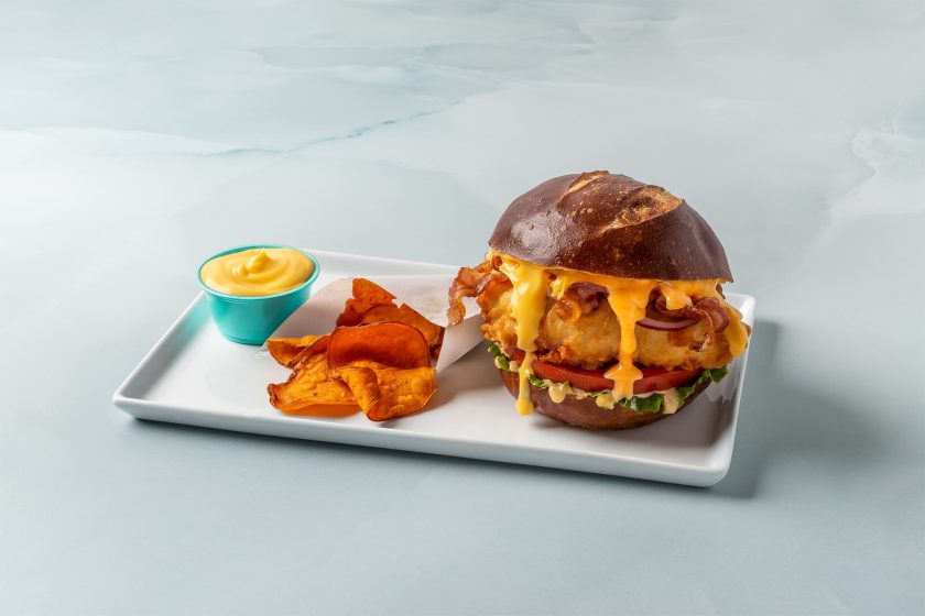 Similarly, the recipes for this indulgent Buttermilk Fried Chicken Bacon Cheddar Sandwich starts with Muy Fresco® Mild Cheddar Cheese Sauce. But chefs can employ other AFP sauces to produce variations in flavor complexity. “Increase the cheddar cheese intensity to create a rich, comforting flavor,” Gable suggests. “Or incorporate flavor differentiation by using a sharper type, like Wisconsin cheddar.” This recipe further dials up the crave factor by adding an aioli made with mayonnaise, maple syrup and Sriracha.